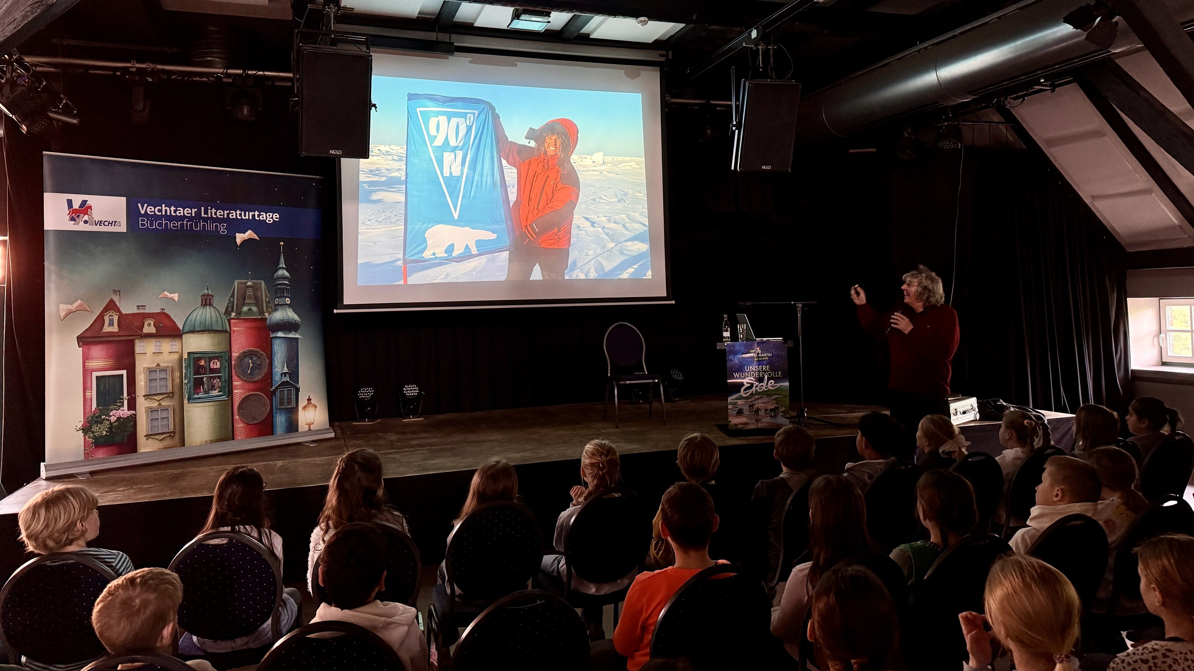 Zum Abschluss des Kinderprogramms der 33. Vechtaer Literaturtage war der berühmte Fotograf Michael Martin zu Gast. Er reist seit knapp 50 Jahren um die Erde. Im Gulfhaus nahm er die Kinder der Marienschule Oythe und der Grundschule Hagen nun mit auf eine Weltreise zu vielen faszinierenden Orten. In dem Fotovortrag zeigte Martin ihnen auch die Auswirkungen des Klimawandels.