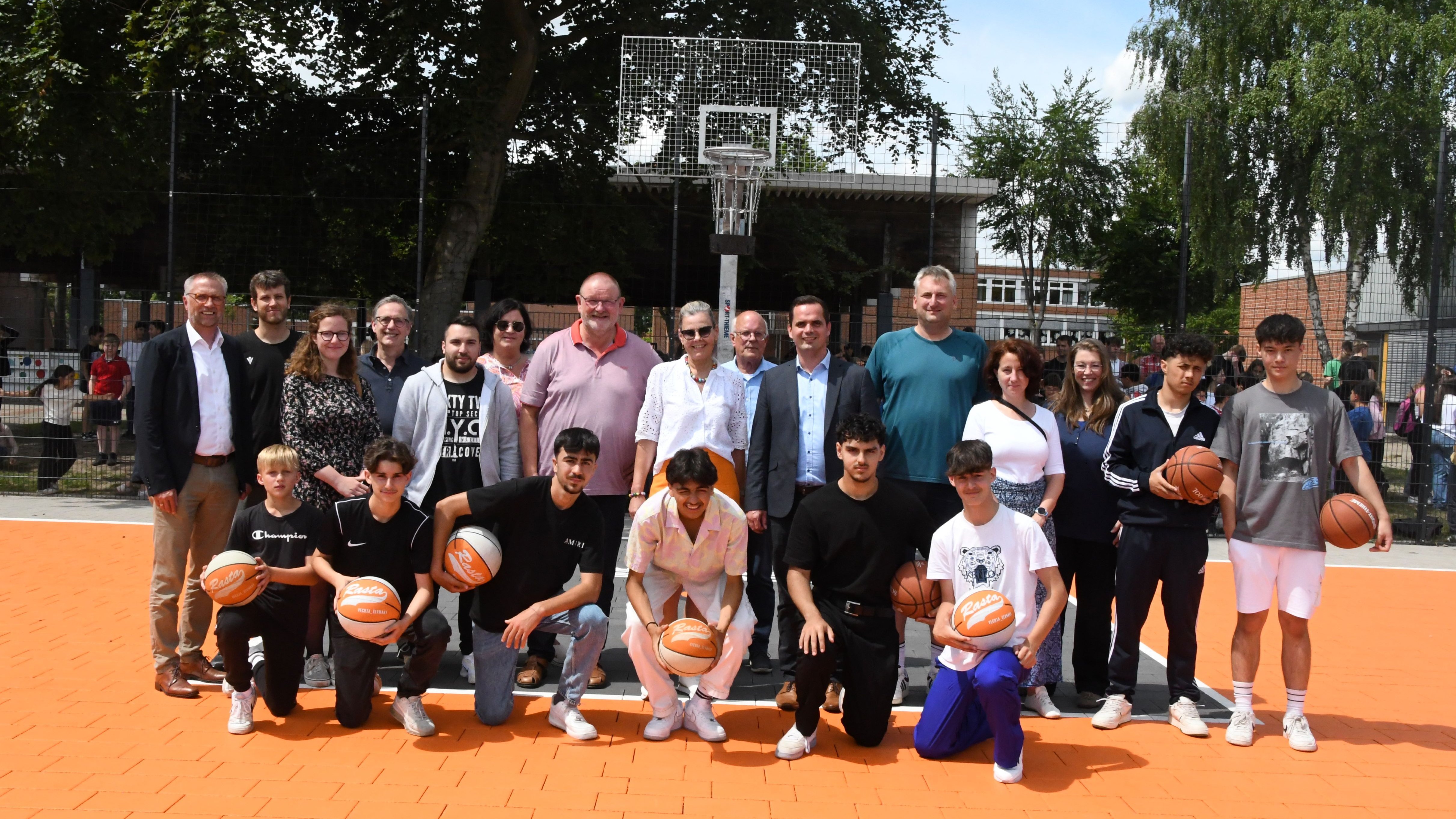 An der Geschwister-Scholl-Oberschule ist ein neuer Basketball-Court ab sofort bespielbar. Bürgermeister Kristian Kater begrüßte zur Freigabe der Spielfläche unter anderen eine Abordnung von Rasta Vechta um Klubchef Stefan Niemeyer. Der Verein wird den Court für ihr Projekt „Courts 2 Gather“ nutzen. Mit dabei waren Vertreterinnen und Vertreter aus dem Stadtrat und der Verwaltung sowie den Bereichen Schulsozialarbeit und Streetwork. Die größte Gruppe bei der Einweihung stellte die GSO. Schulleiterin Anke Magerfleisch, das Kollegium und die Schülerinnen und Schüler freuten sich ganz besonders über die Freigabe. Die Jugendlichen warfen am Dienstag die ersten Körbe auf der neuen Anlage.