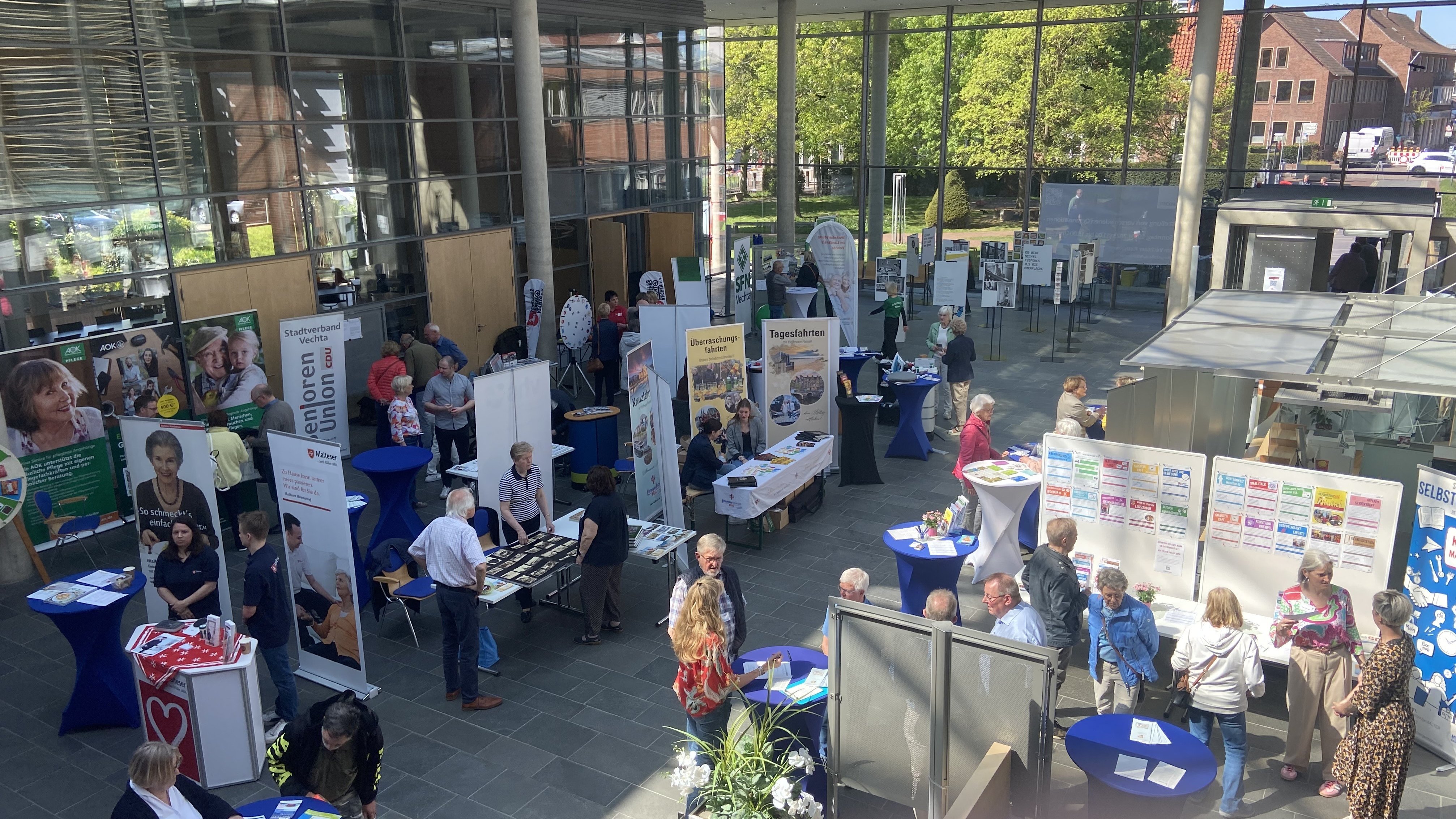Wie umfangreich das Angebot für die ältere Generation in Vechta ist, hat der „Tag der Senioren“ im Rathaus gezeigt. 20 Institutionen und Vereine informierten im Rathaus darüber, was sie in den Bereichen Pflege, Freizeit, Beratung und Selbsthilfe zu bieten haben. Viele Besucherinnen und Besuchern machten sich an den Info-Ständen im Foyer schlau, knüpften Kontakte und nutzten die Sportangebote auf der Freifläche vor dem Rathaus.