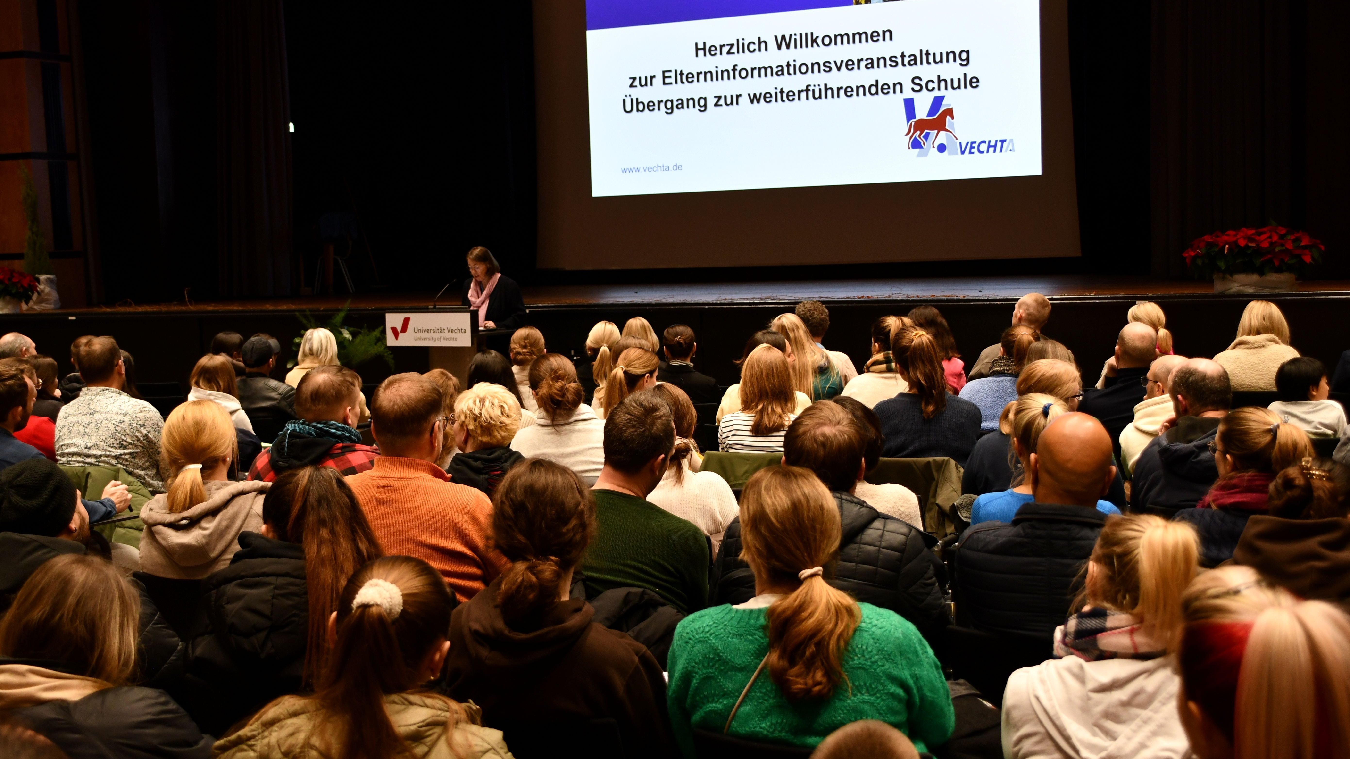 Das Interesse an dem Format, das die Stadt Vechta 2023 ins Leben gerufen hatte, war erneut sehr groß. Circa 250 Mütter und Väter kamen in die Aula der Universität. Alle Schulleitungen waren dem Aufruf der Stadtverwaltung gefolgt. Vechtas Erste Stadträtin Sandra Sollmann begrüßte Ina Gärtner (Geschwister-Scholl-Oberschule), Dr. Dorothee Belling (Ludgerus-Schule), Inge Wenzel (Gymnasium Antonianum), Pater Christian Flake (Kolleg St. Thomas) und Christina Meyer (Liebfrauenschule). Stellvertretend für die Berufsschulen im Landkreis Vechta sprach Frank Stach (Handelslehranstalten Lohne).