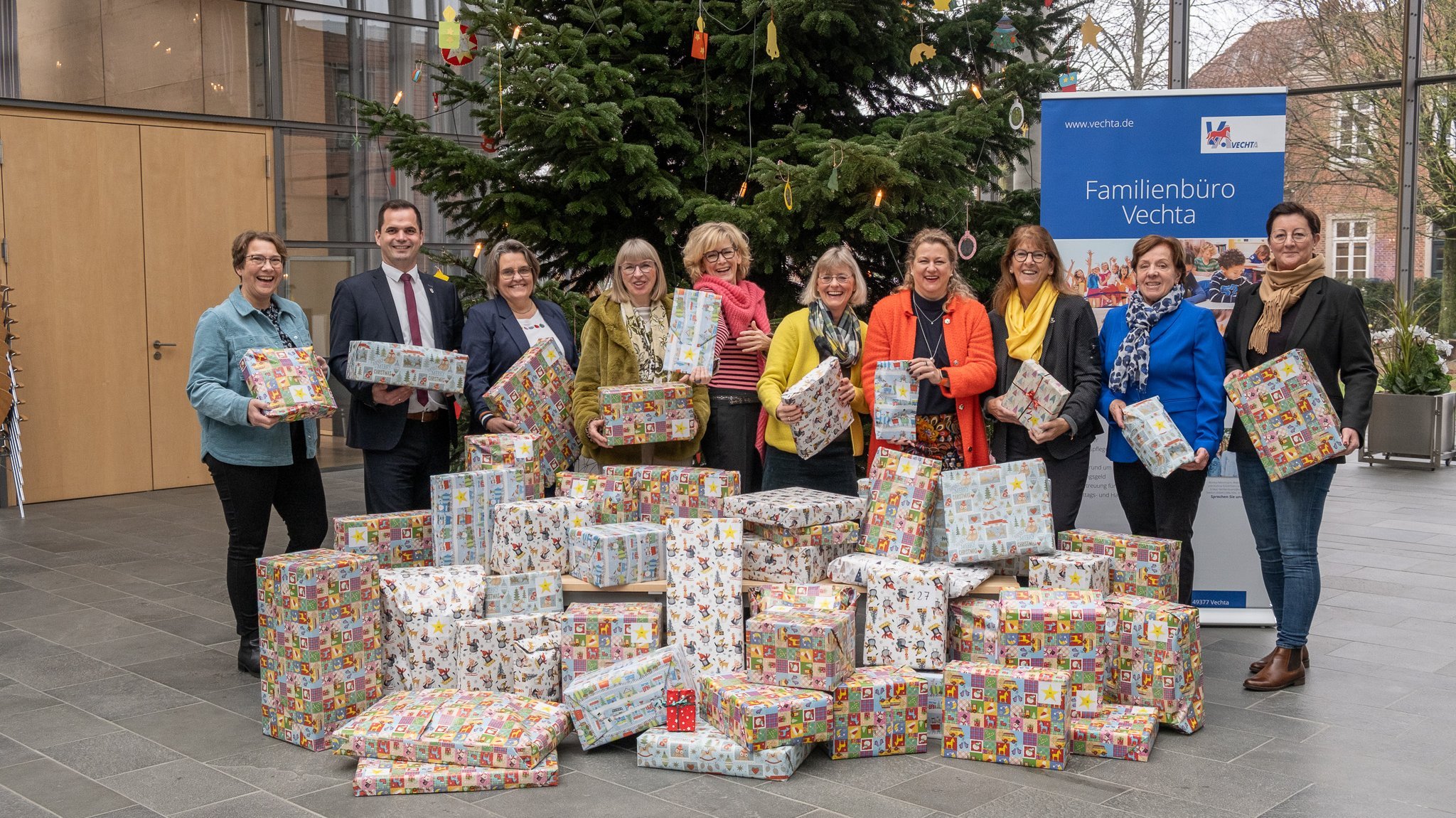 Der Inner Wheel Club Vechta macht dieses Jahr in Zusammenarbeit mit der Stadt Vechta wieder Kindern eine Freude. Die Mitglieder überreichten gestern (13. Dezember) Bürgermeister Kater und Andrea Schlärmann vom Familienbüro sechzig Geschenke mit einem Gesamtwert von etwa 3.000 Euro. Diese wird das Familienbüro an bedürftige Familien in Vechta verteilen. Die Kinder konnten bereits im Vorfeld Wunschzettel ausfüllen.