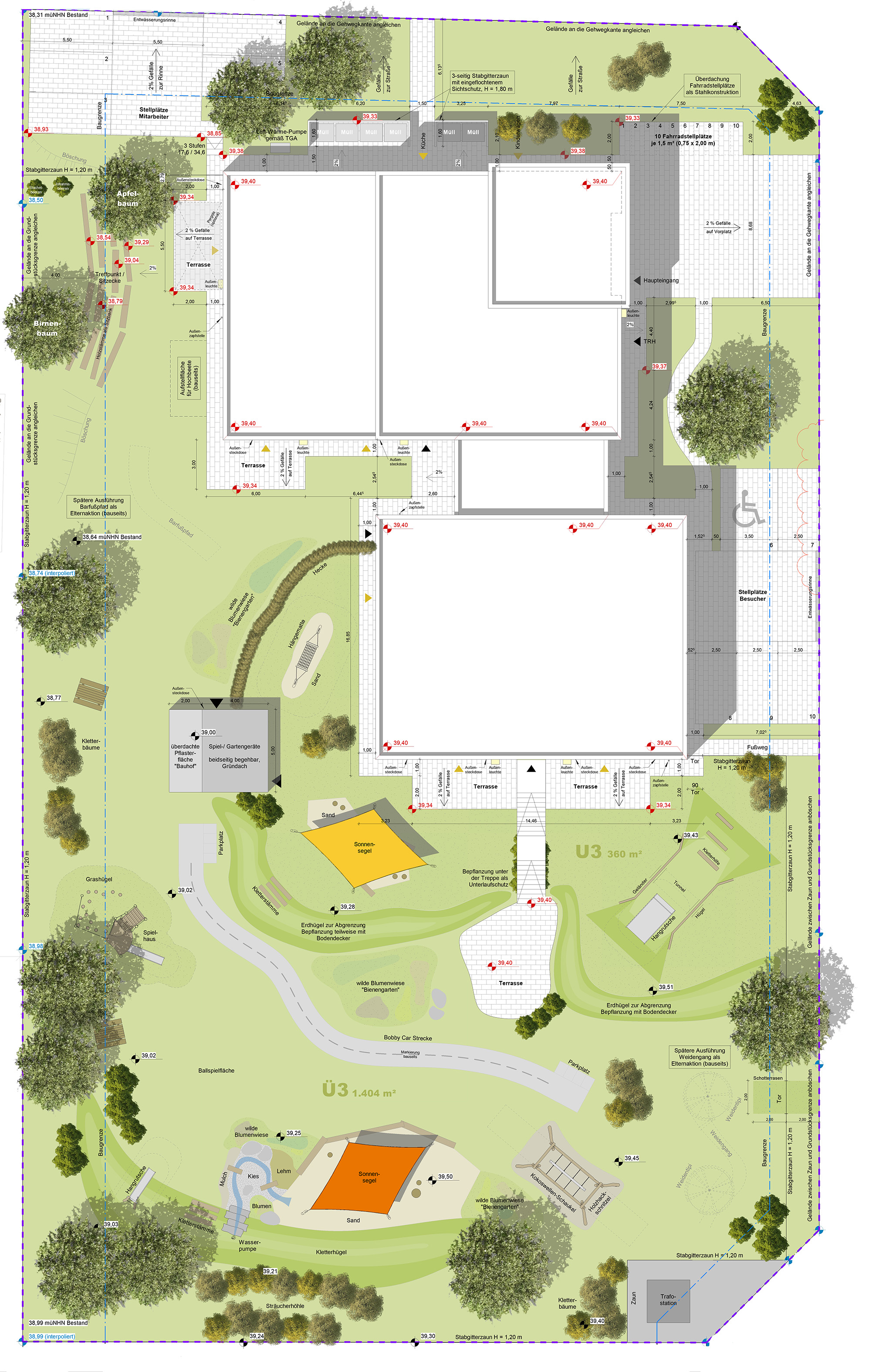 Kokoswellen und Erdtunnel, Hängematten und Obstbäume, Bobbycar-Strecke, Kiesbett-Wasserlauf, Hangrutsche, Bienengarten, Sträucherhöhlen, Barfußpfad und so viel mehr – aktuell ist‘s zwar eine reine Sand- und Betonwüste hier in Bergstrup. Doch schon im kommenden Sommer wird ein Großteil der bislang nur als Zeichnung vorliegenden Außenpläne zur neuen Kindertagesstätte mitten im Neubaugebiet um- und eingesetzt sein.