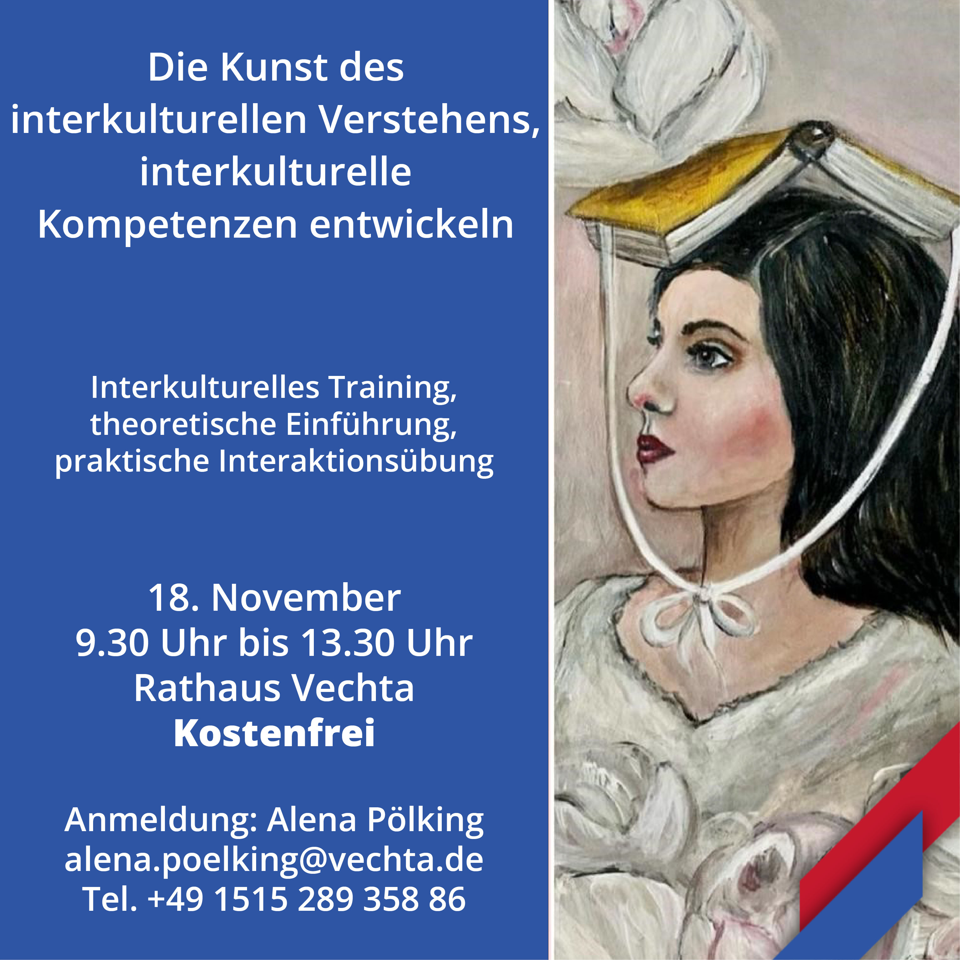 Ein interkulturelles Training findet im Vechtaer Rathaus am 18. November von 9.30 bis 13.30 Uhr statt. Die Dozentin Veronika Fraile hatte bereits im Mai ein Training für russischsprachige Bürgerinnen und Bürger Vechtas organisiert. Aufgrund der guten Resonanz bei den Teilnehmenden folgt nun eine Wiederholung in deutscher Sprache.