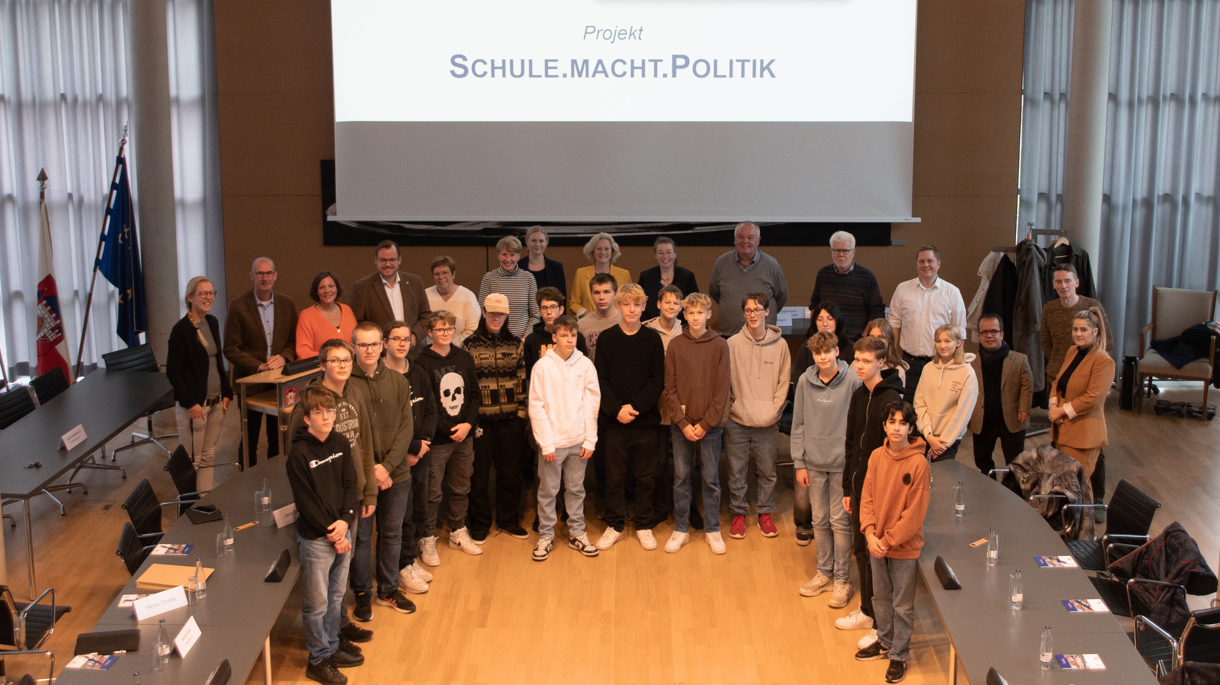 Das Projekt „Schule.Macht.Politik“ geht nach der Auftaktveranstaltung am 14. November (Dienstag) in die dritte Runde. Die Ludgerus Schule folgt damit auf die Geschwister-Scholl-Oberschule und das Kolleg St. Thomas. „Willkommen im Herzen der Demokratie in der Stadt Vechta“, begrüßte die Erste Stadträtin Sandra Sollmann die Schülerinnen, Schüler und Lehrkräfte im Ratssaal des Rathauses. Auch mehrere Mitglieder des Stadtrates sowie die Stadtratsvorsitzende Simone Göhner waren anwesend, um sich vorzustellen und erste Fragen zu beantworten.
